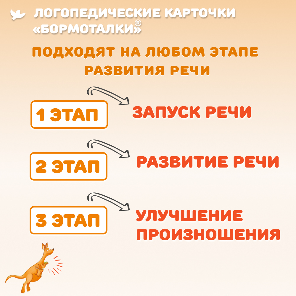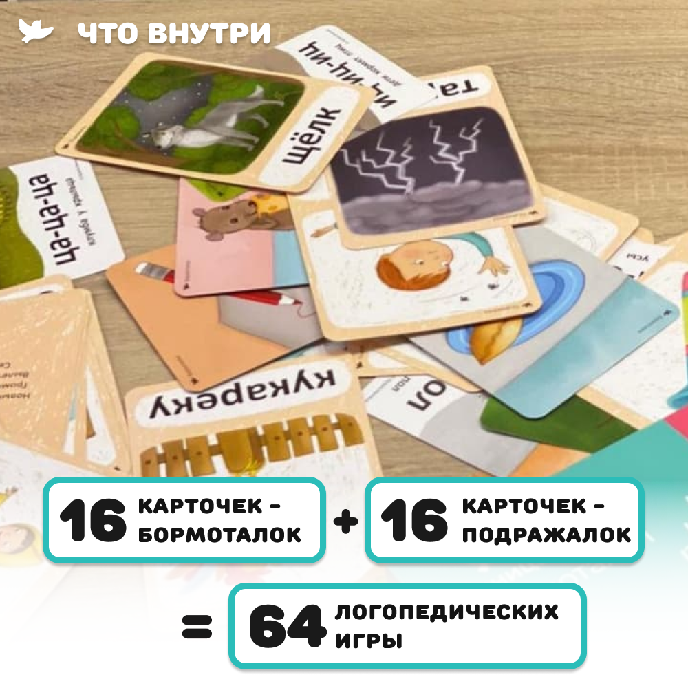 • 16 двусторонних ламинированных логопедических карточек (32 бормоталки) с закругленными краями, красивыми иллюстрациями и логопедическими дорожками.