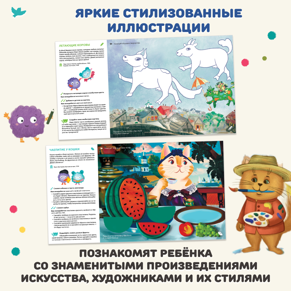 Сюжеты арт-листов вдохновлены известными произведениями искусства. Вы встретите отсылки к Винсенту Ван Гогу, Фриде Кало, Василию Кандинскому и др., а ещё вас ждут наскальные росписи, античные мозаики, средневековые ковры гобелены и другие шедевры разных времён! Для ребёнка все они представлены в лёгкой весёлой форме – через игру с чудиками Пышкой и Пухом.