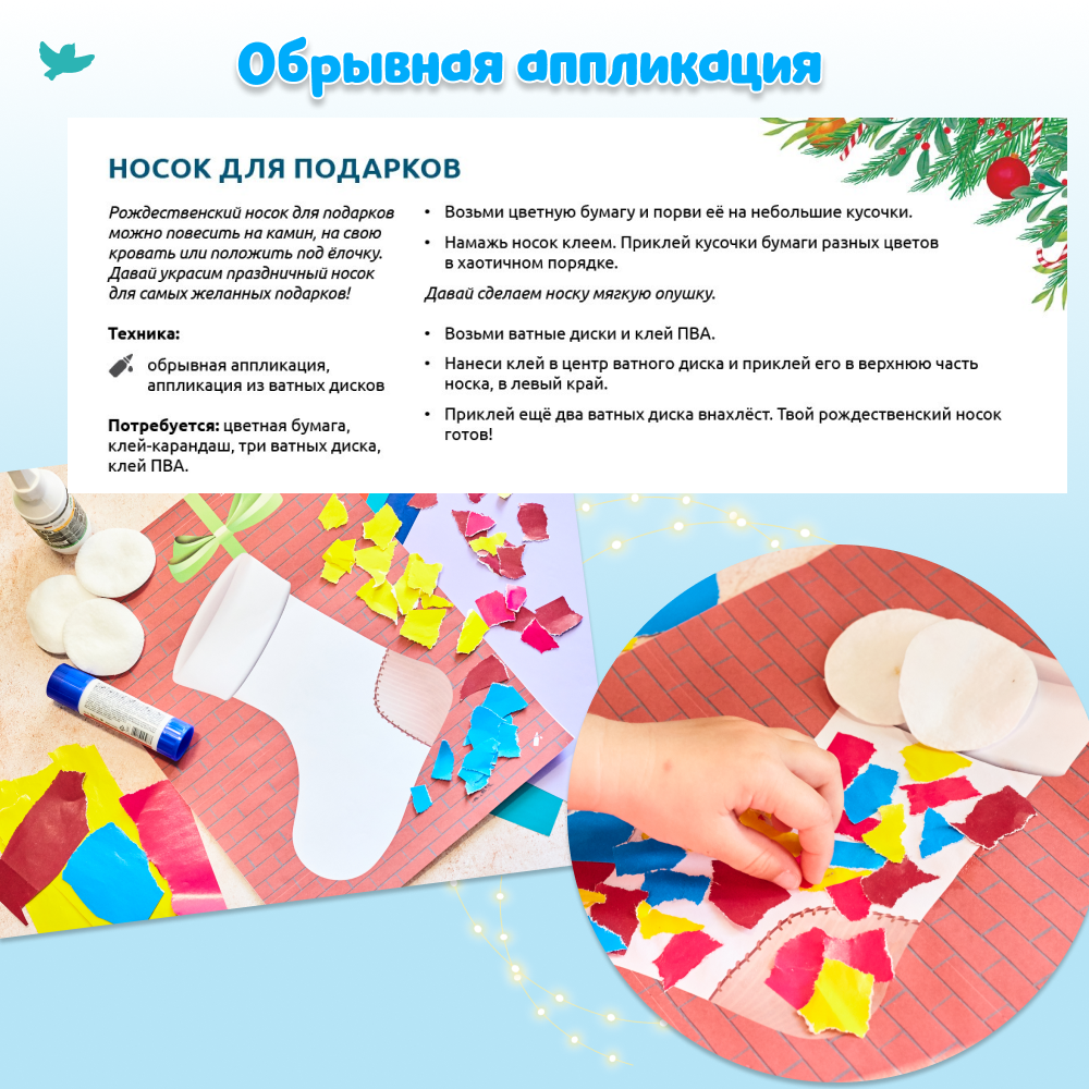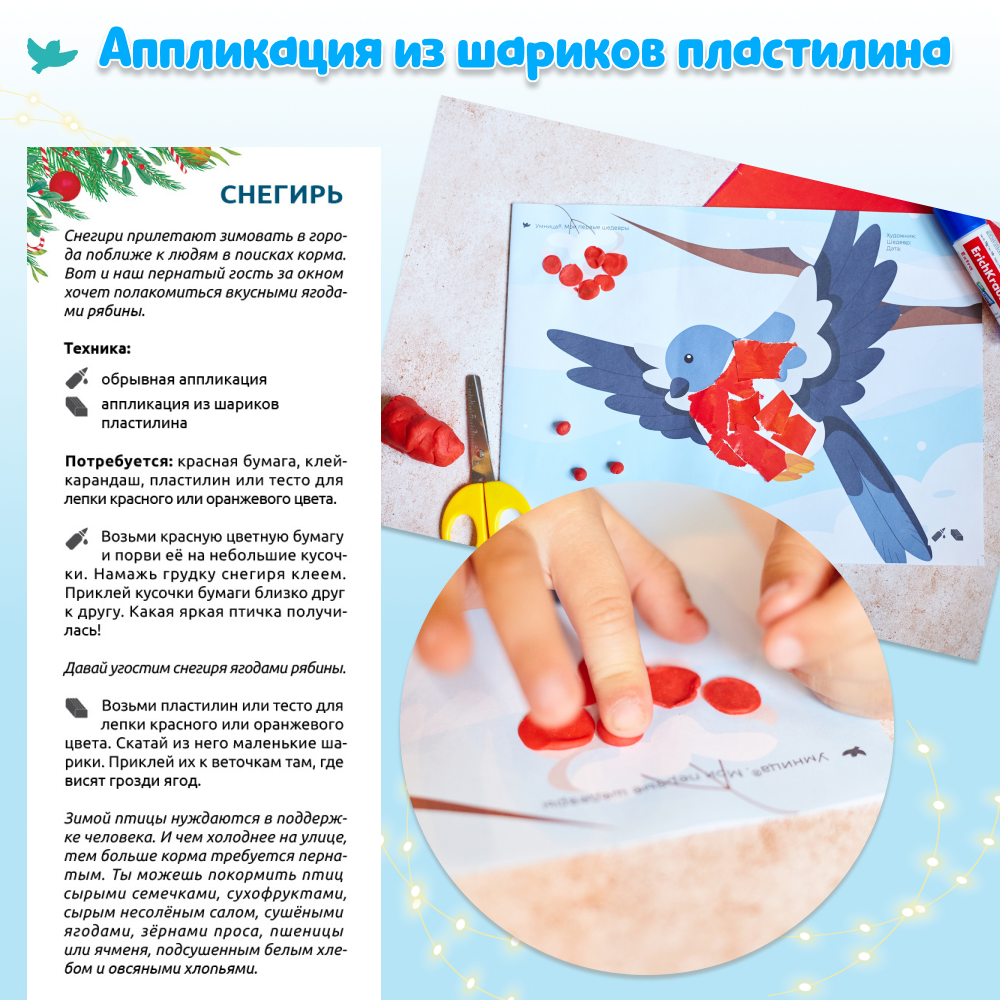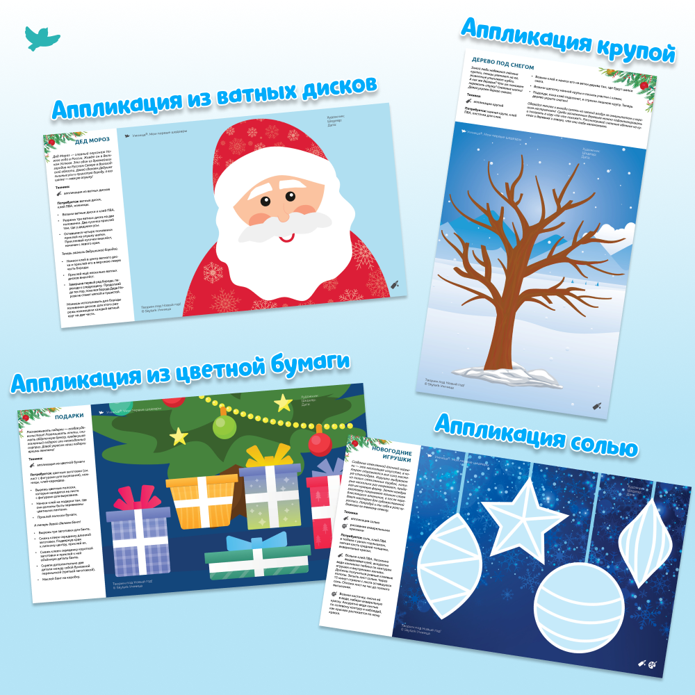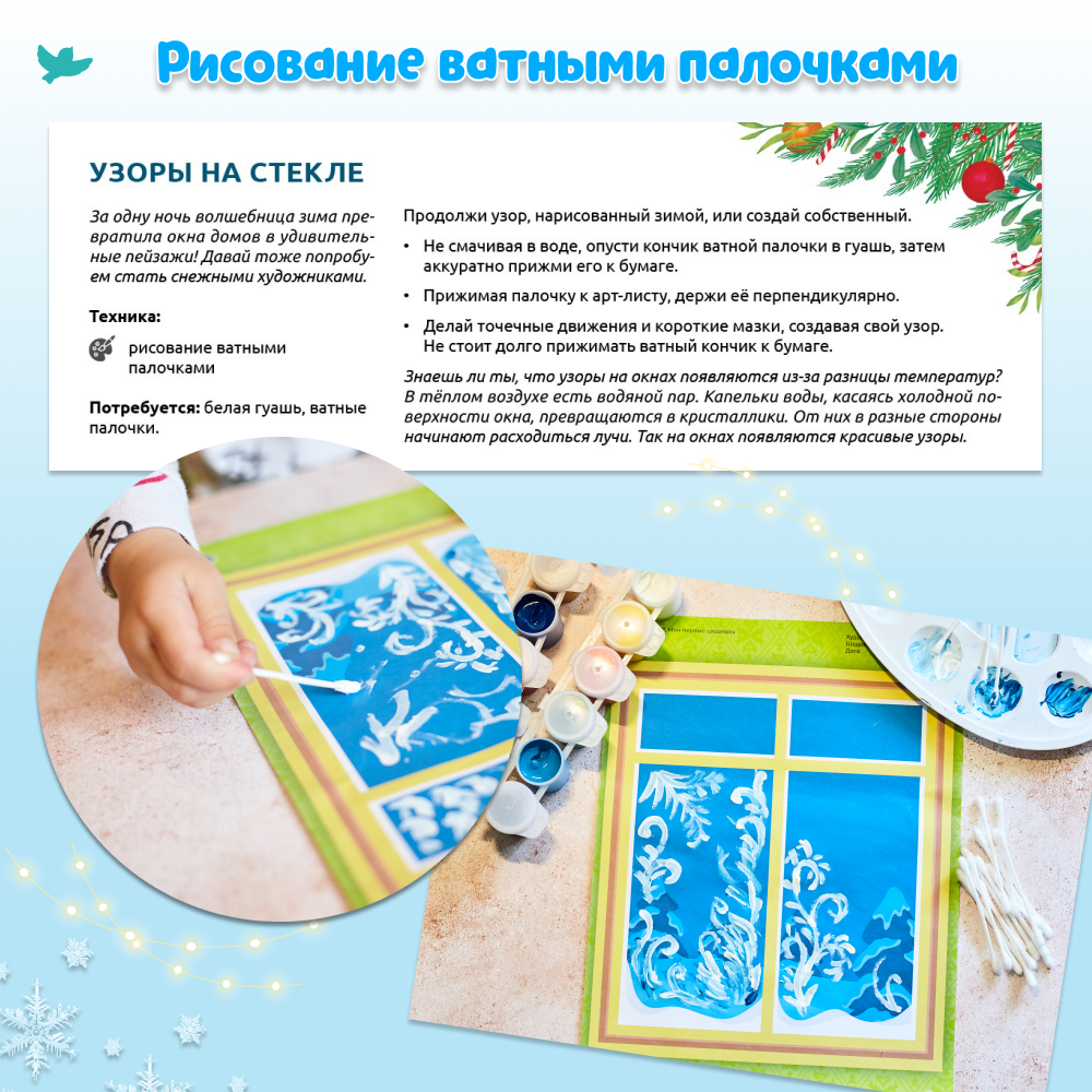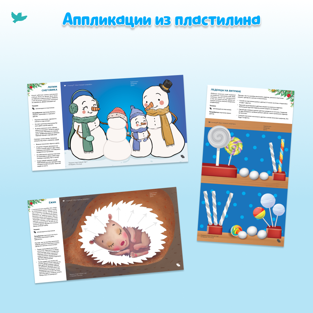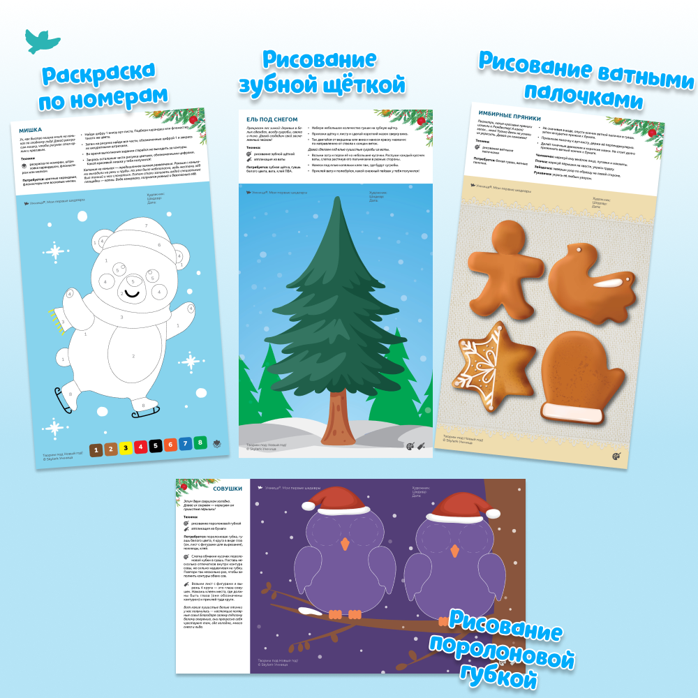 Ребёнок будет украшать имбирные пряники, наряжать ёлку, устроит волшебный снегопад для семьи пингвинов, а ещё сделает своими руками новогоднюю открытку! Вот так весело малыш учится рисовать, вырезать, придумывать – творить!